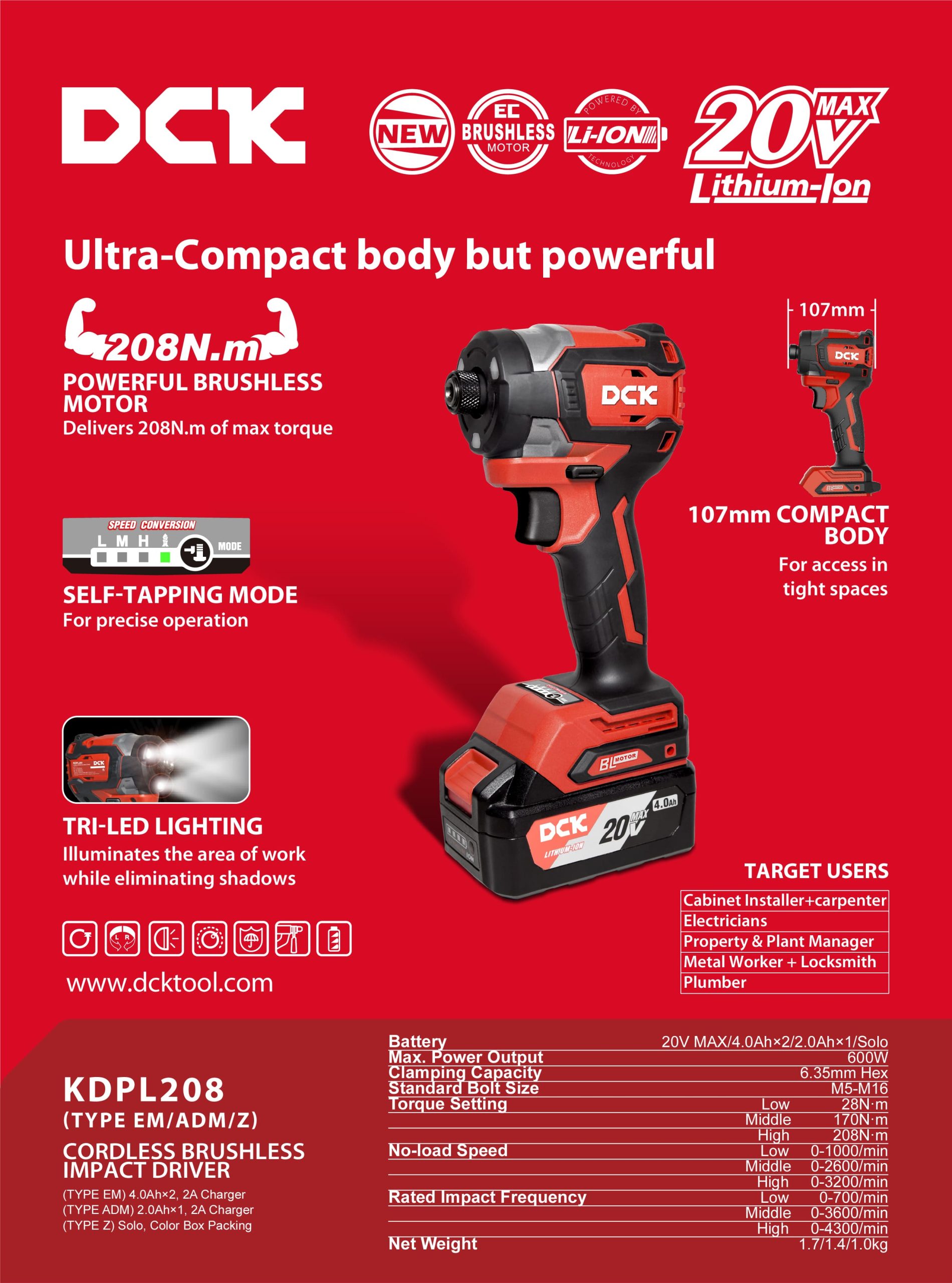 KIT 20V LLAVE DE IMPACTO 1/4″ + ATORNILLADOR BRUSHLESS KDKIT26 (EK 4Ahx2) DCK